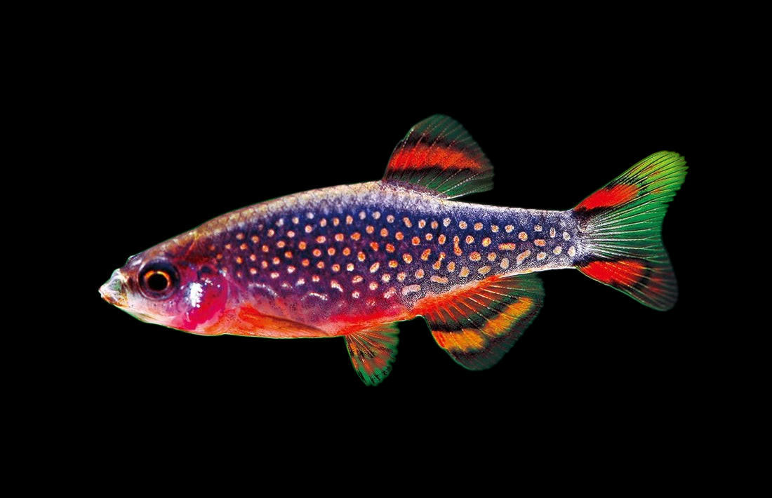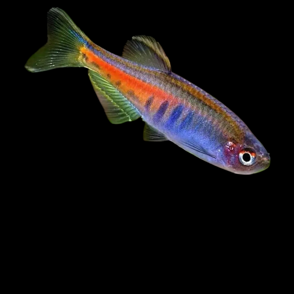 A Glofish - Sunburst Orange Tetra with green fins and a rounded body, set against a black background.